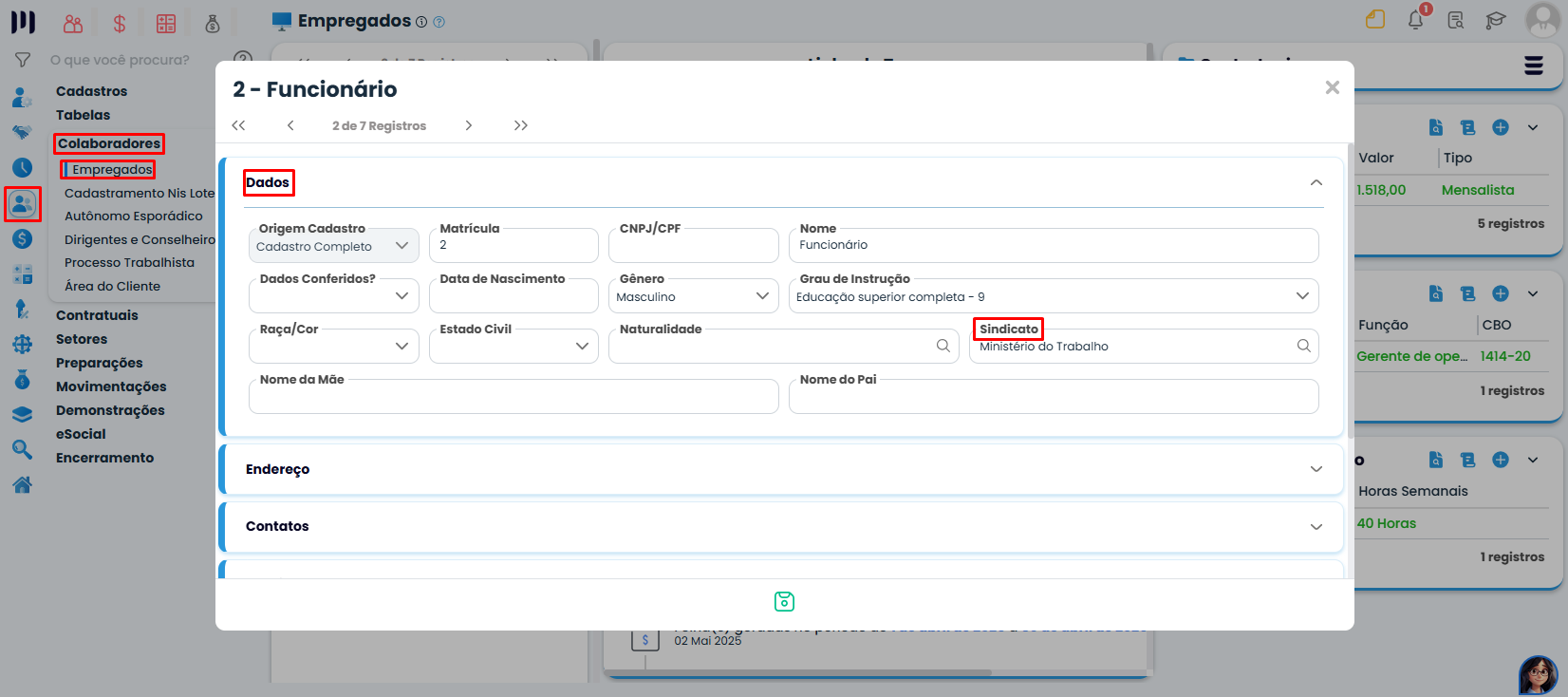 Passo 3: Na aba Dados, encontre o campo Sindicatos e anote o sindicato que está vinculado ao colaborador.