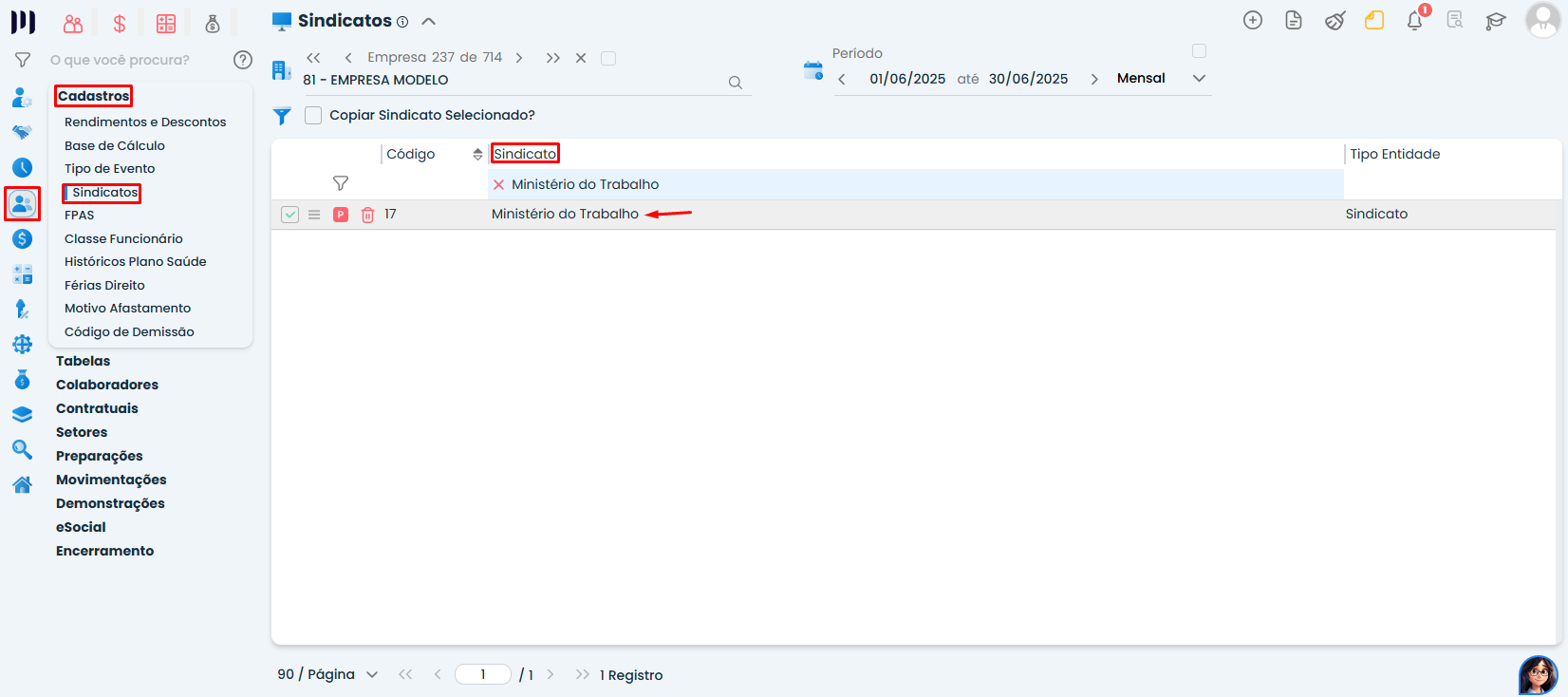 Passo 4: Agora, acesse o menu Pessoal, depois vá em Cadastros e clique em Sindicatos.