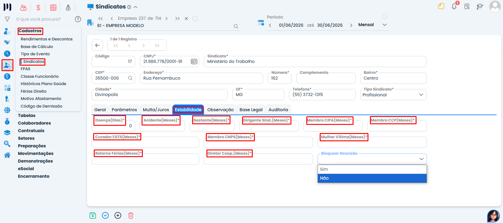 Sempre que cadastrar um novo sindicato ou vincular um colaborador a um sindicato diferente, confira se os dados de estabilidade estão completos.