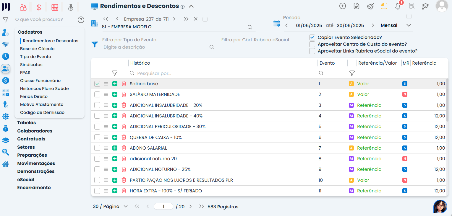 Pesquise pelos eventos utilizados na folha de pagamento atual.