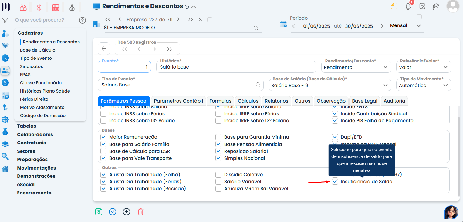 Falta de marcação de insuficiência de saldo nos eventos da folha