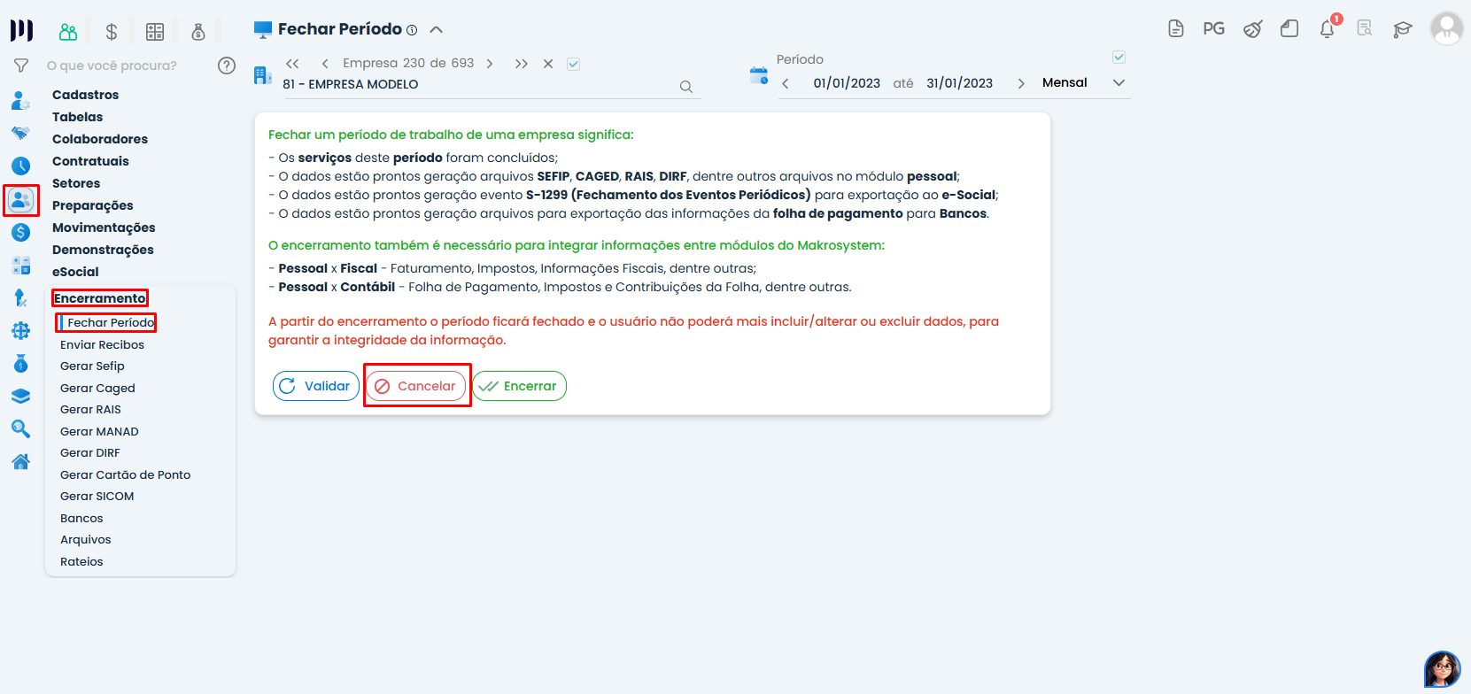 - Acesse a área de Pessoal → eSocial → Encerramentos e clique em CANCELAR para a reabertura de períodos já enviados até o mês da alteração da opção.