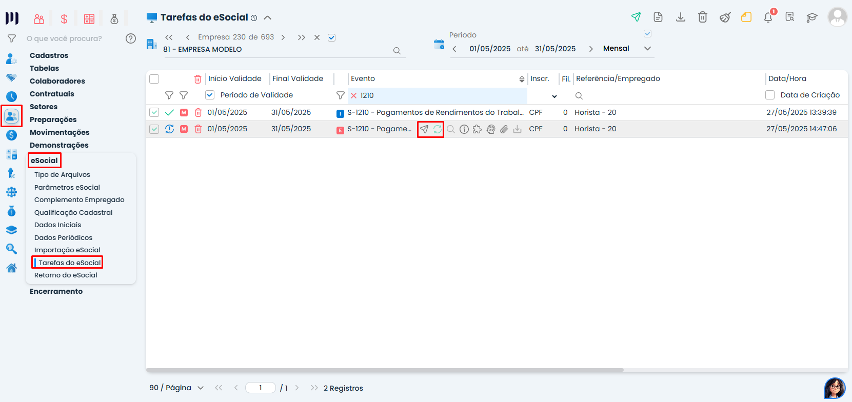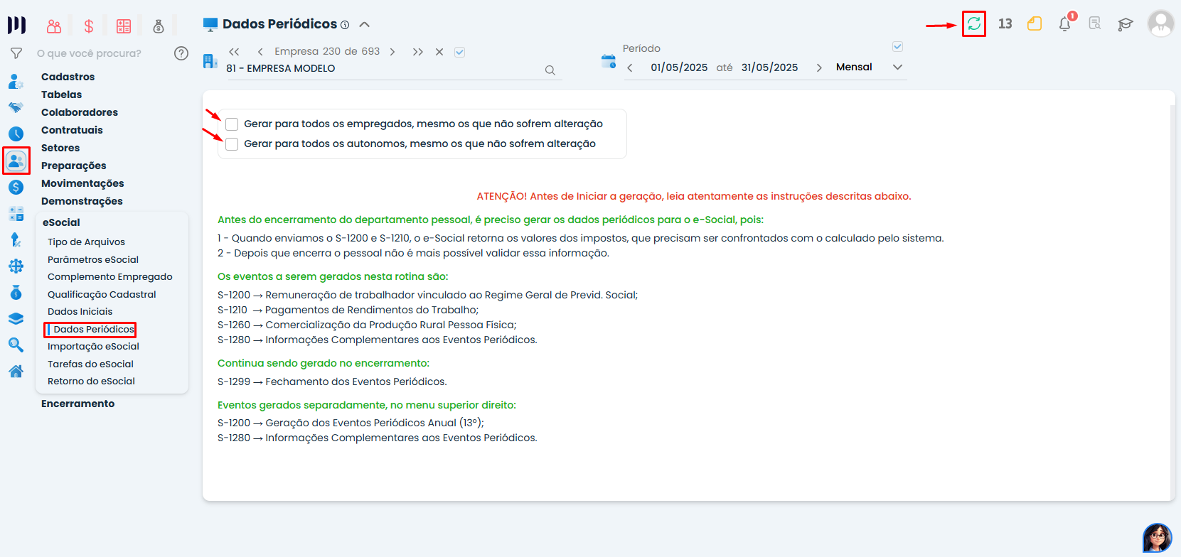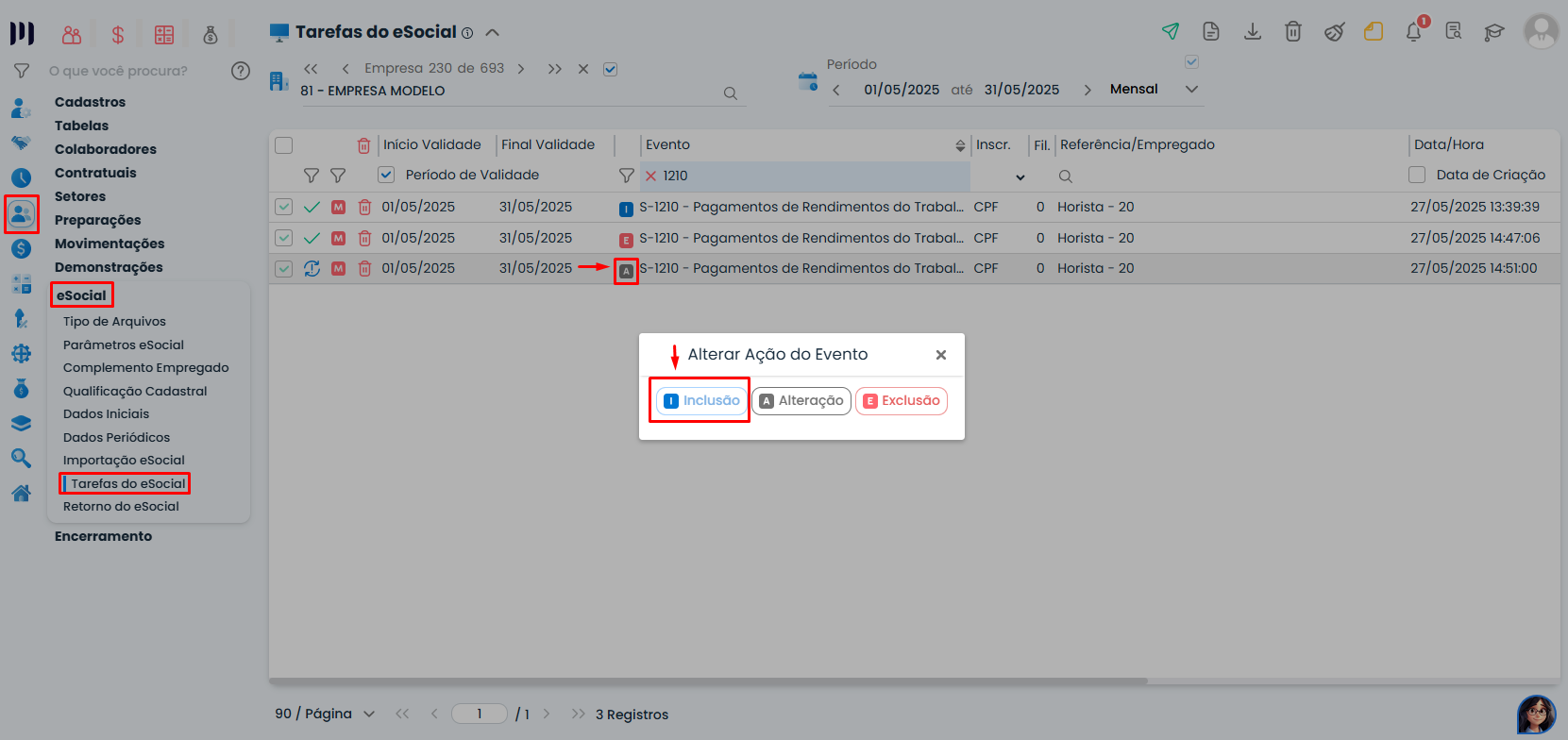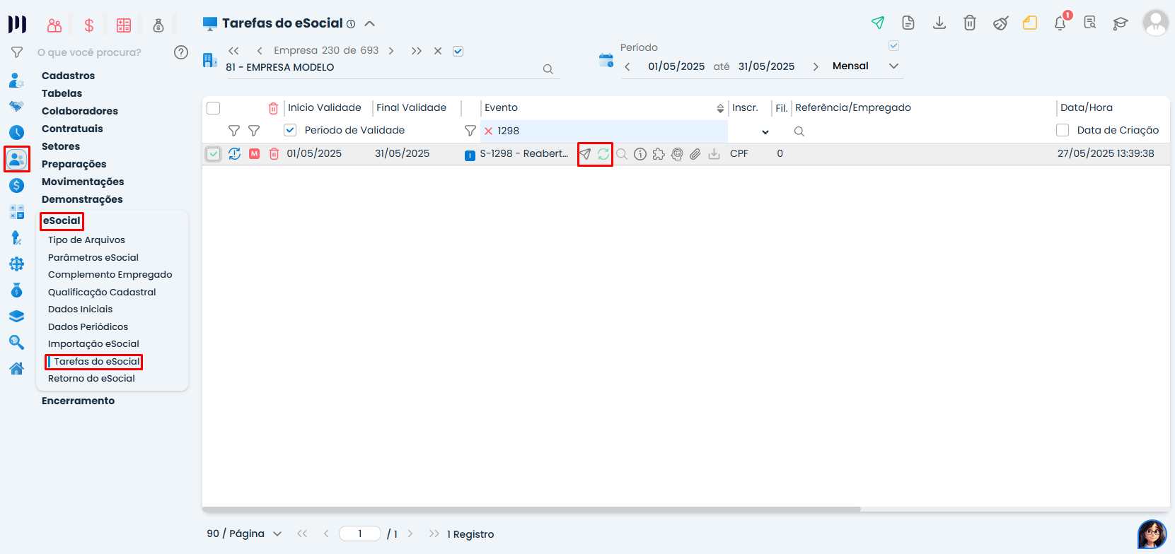 - Na aba Pessoal → eSocial → Tarefas do eSocial e envie o evento S-1298 para reabertura do período.