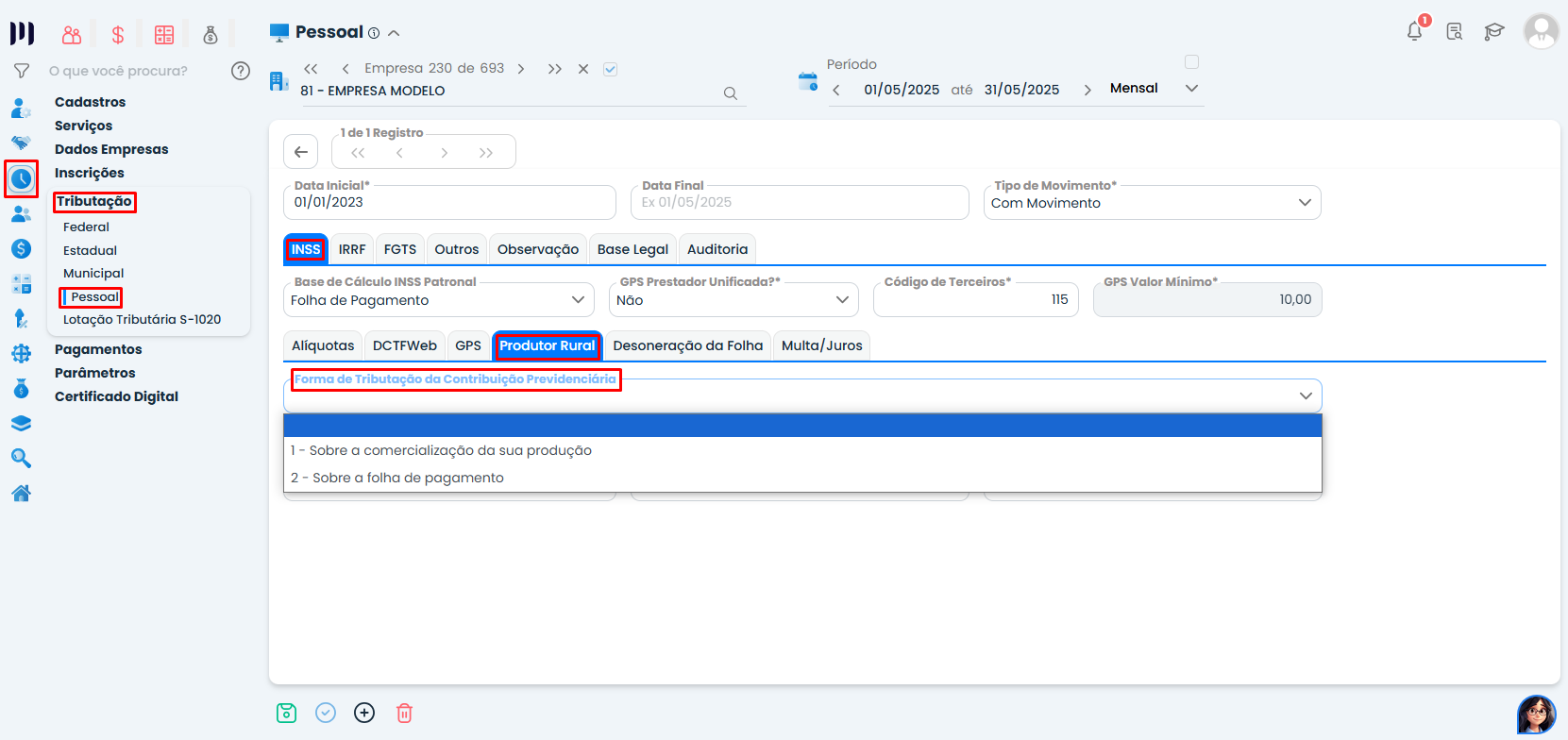Vá até Preparar → Tributação → Pessoal, na aba Produtor Rural.