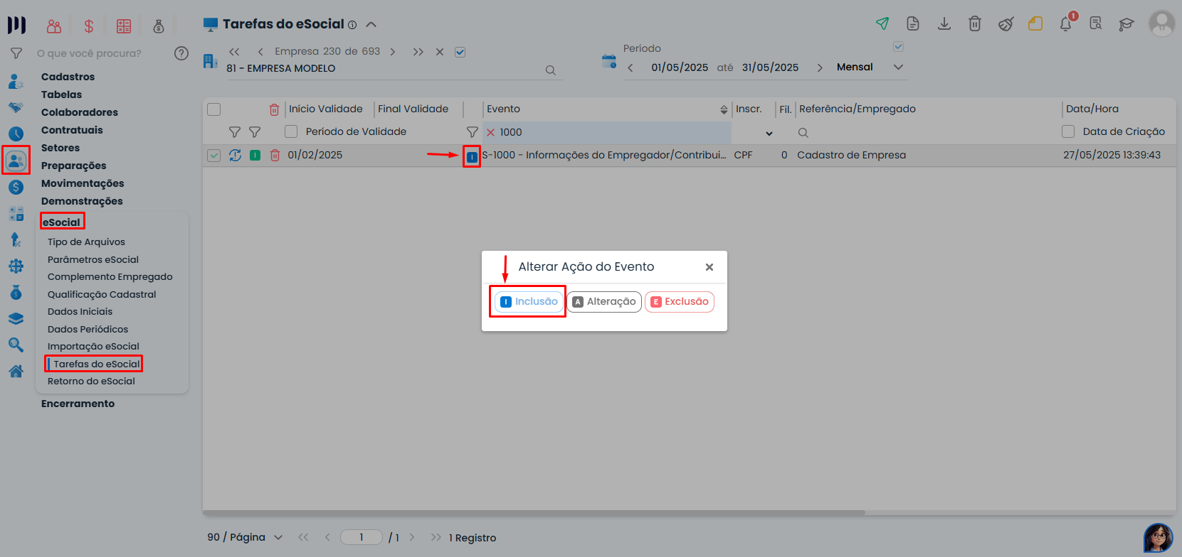 Em Pessoal → eSocial → Tarefas do eSocial será gerado o evento S-1000.
