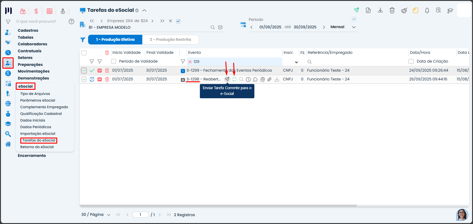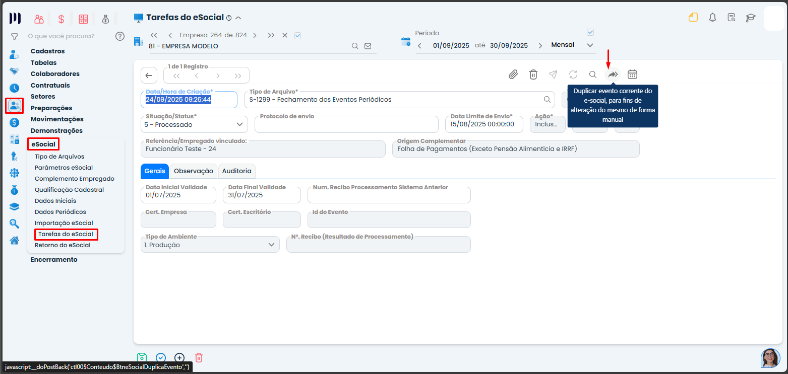 - O sistema irá gerar um novo evento, agora com status de alteração, também na tela de Tarefas eSocial.