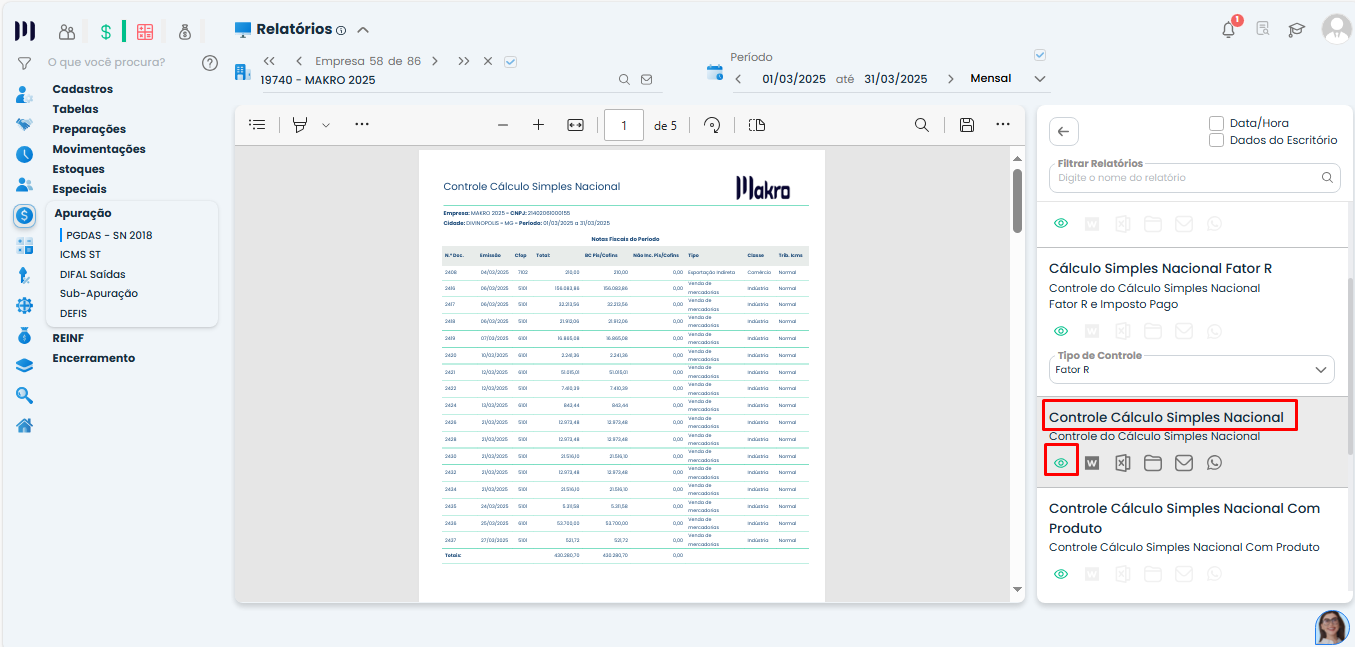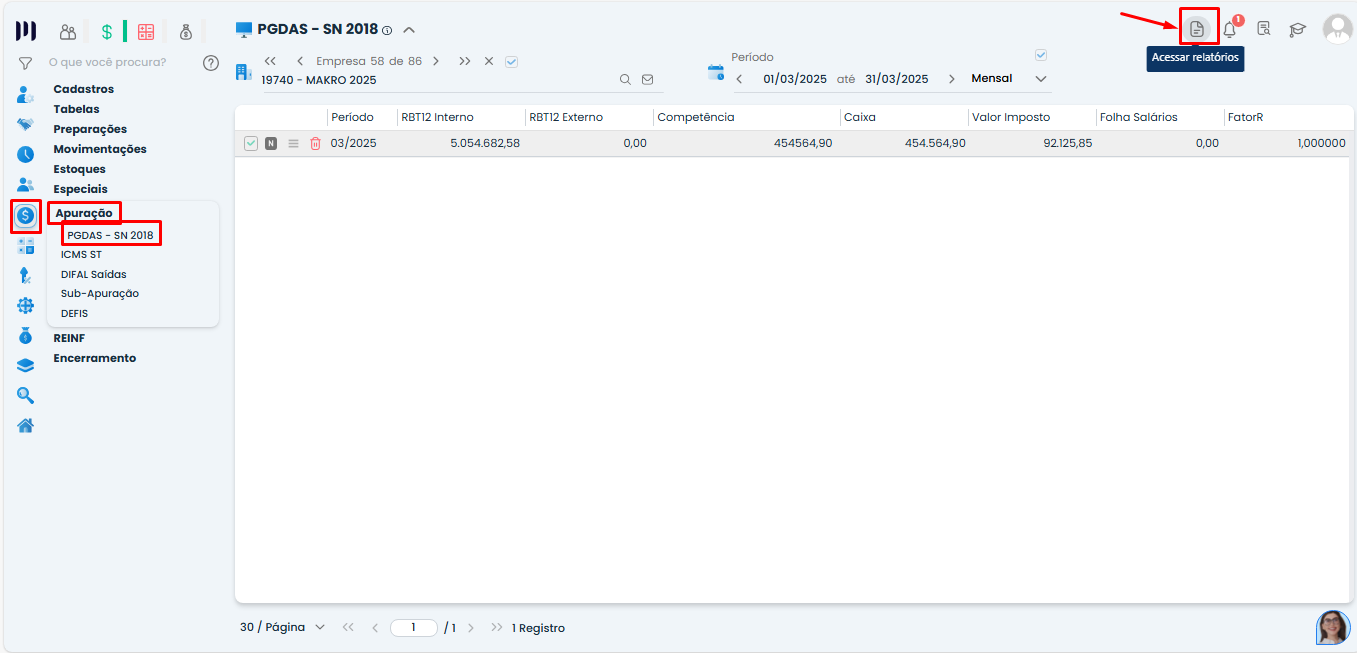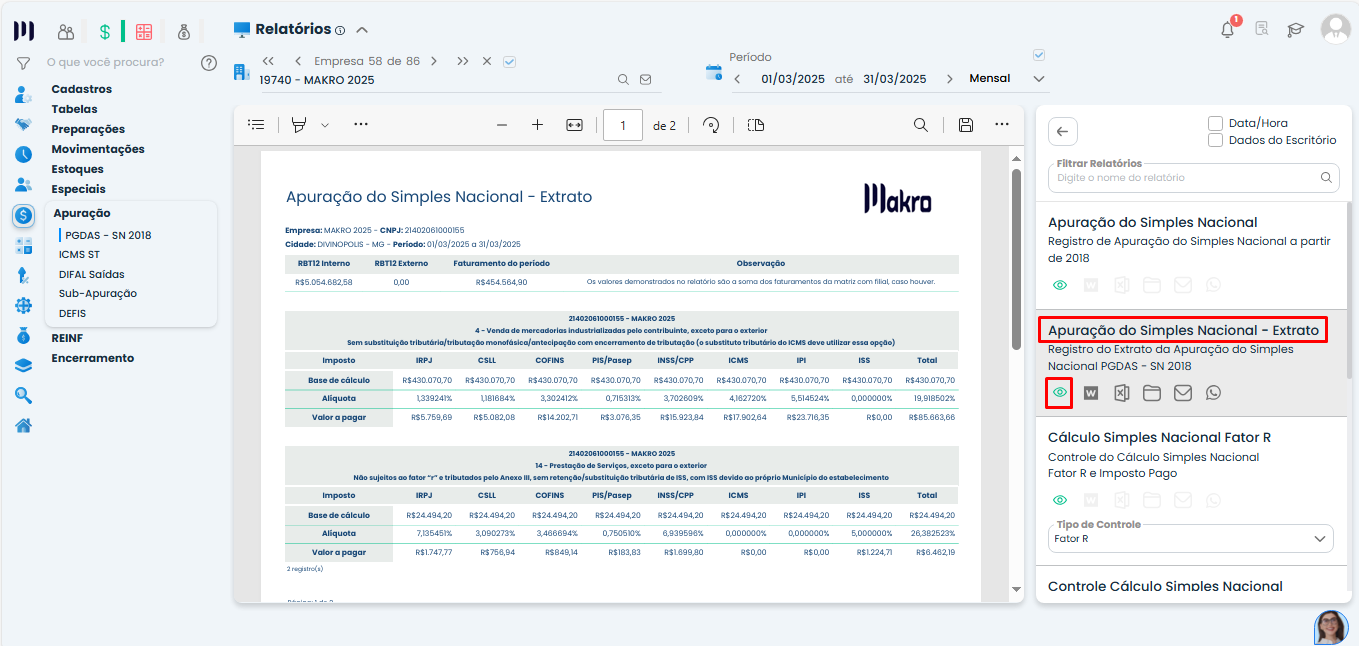 No sistema, vá até o menu Fiscal > Apuração > PGDAS – SN 2018 > Relatórios.