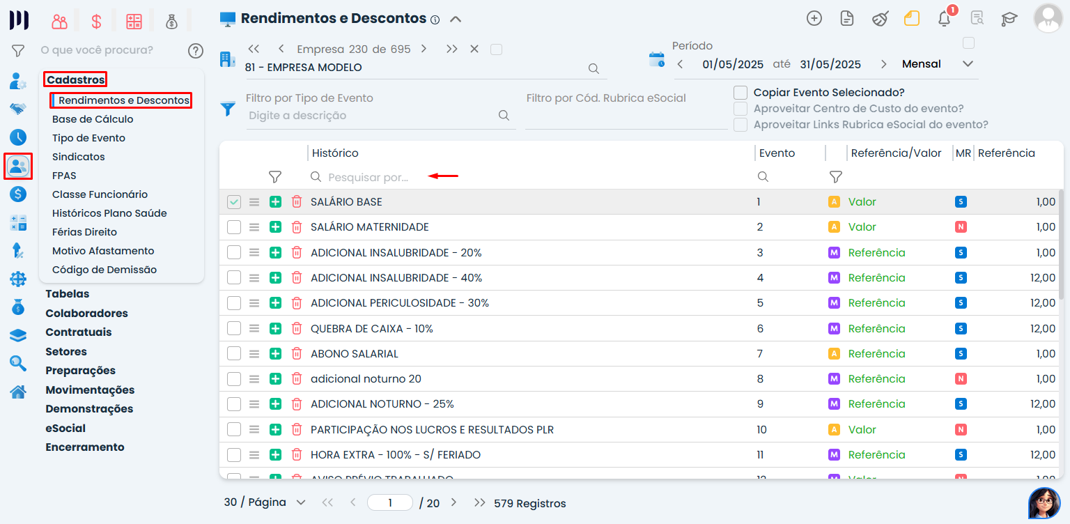 Passo 2: Pesquise no campo Historico pelo evento usado na folha e clique nele.