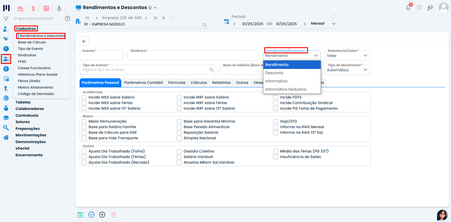 Passo 2: Verifique se o campo Rendimento/Desconto está corretamente configurado (exemplo: provento marcado como “Rendimento” e não como “Desconto”).