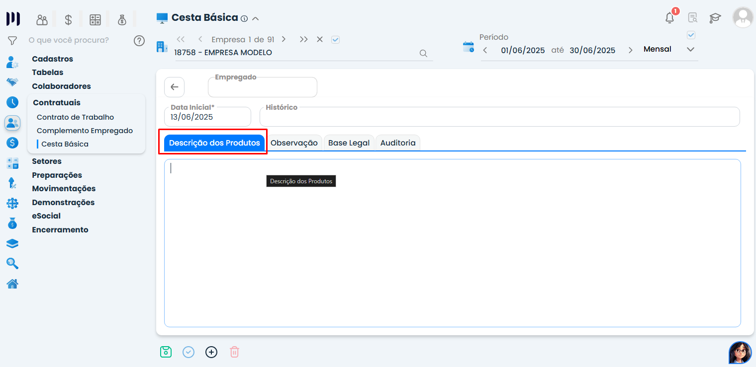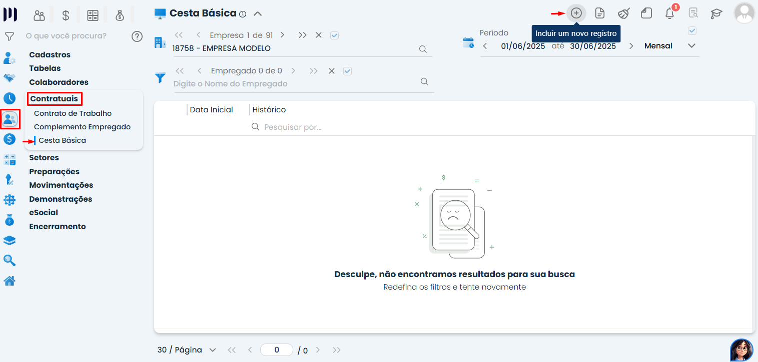 1. Acesse o menu Pessoal>Contratuais>Cesta básica;