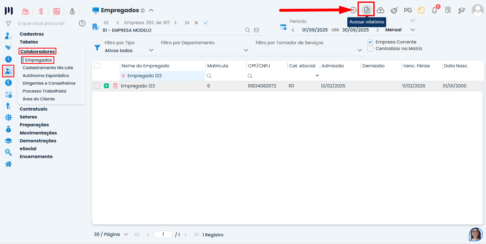 2. Selecione o empregado desejado e clique no ícone Acessar relatórios.
