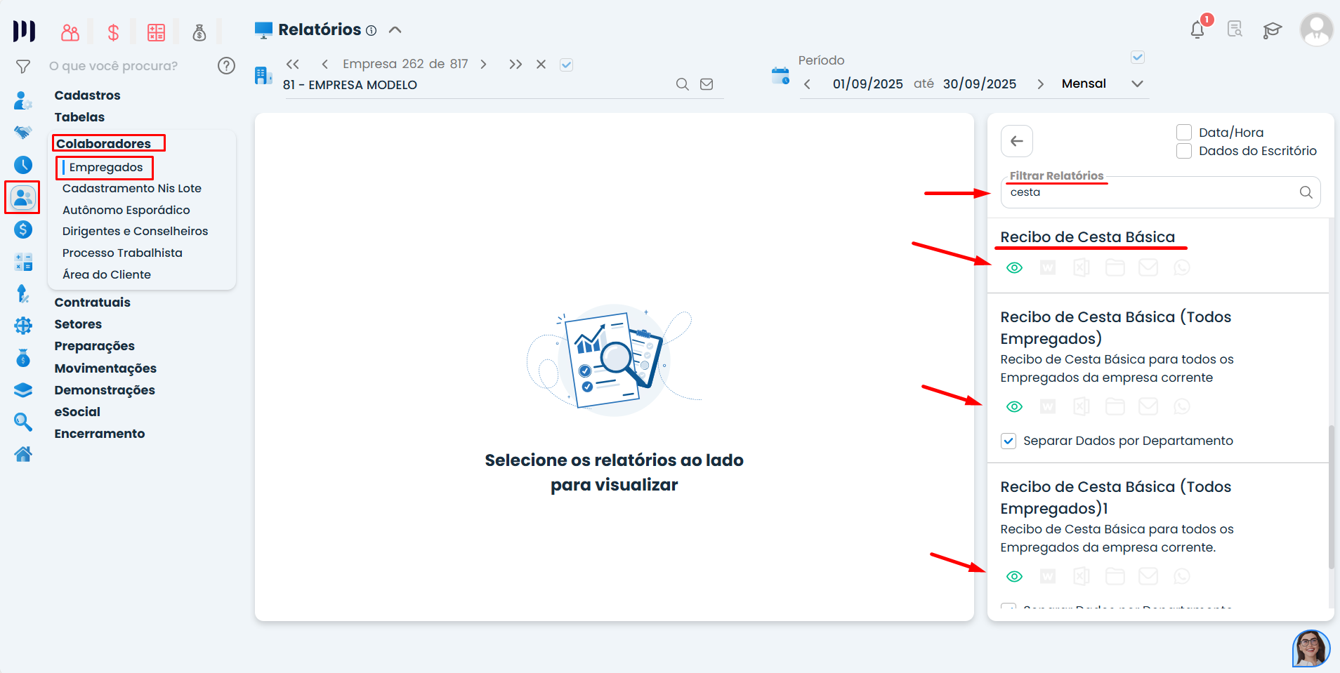 1. Na nova tela, procure pelo relatório chamado Recibo de Cesta Básica, ou encontrar nas demais opções, a que melhor se adequar a necessidade;