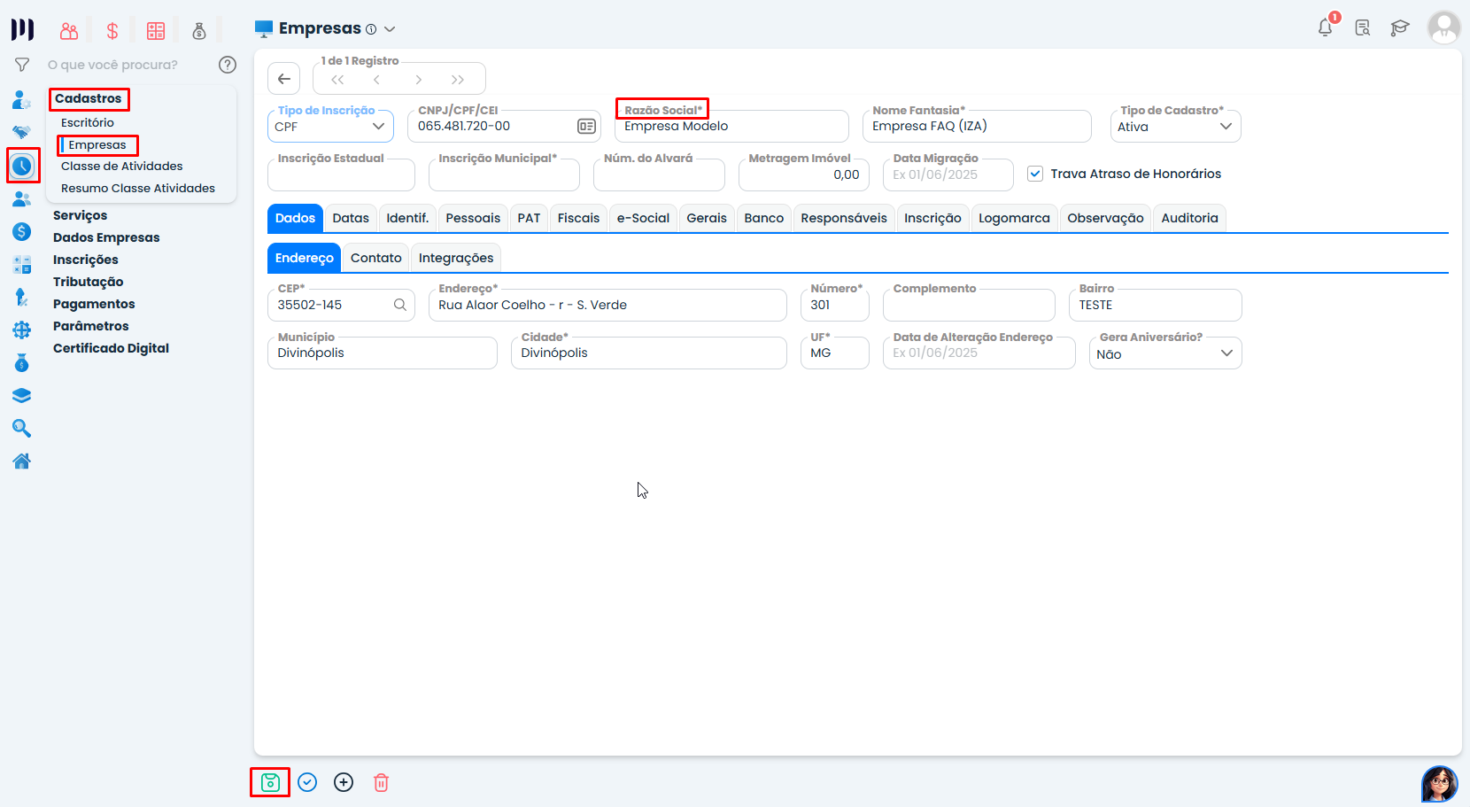 Passo 2: Clique em Empresas para visualizar o cadastro da sua empresa.