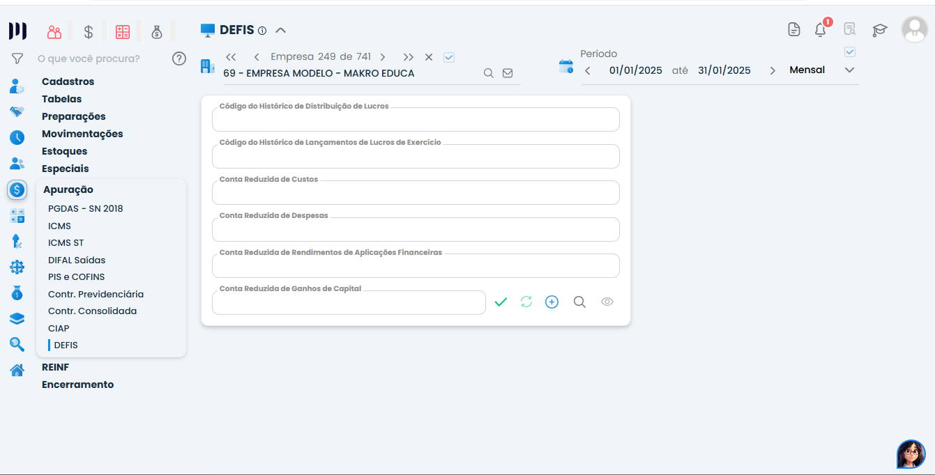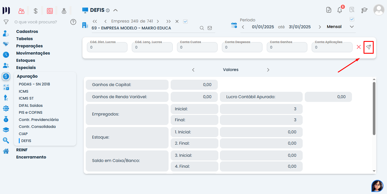 Fiscal > Apuração > DEFIS - Preencha os campos obrigatórios: