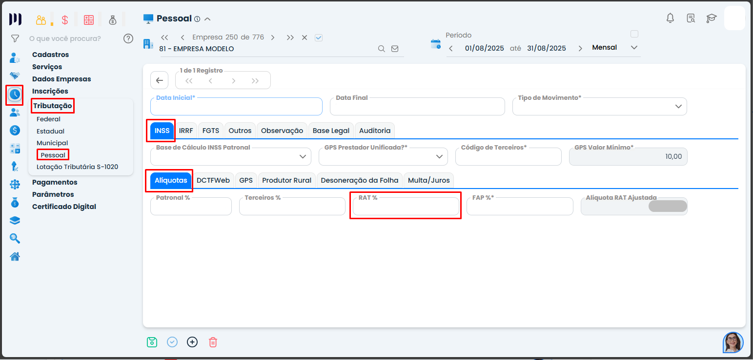 Passo 3: Preencha os dados nas abas “INSS” > “Alíquota” > “RAT %” com a nova alíquota;