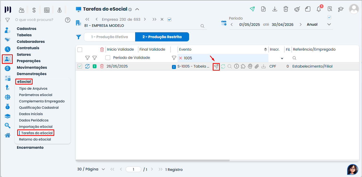 Passo 5: O sistema gerará automaticamente o evento S-1005. Para enviá-lo: