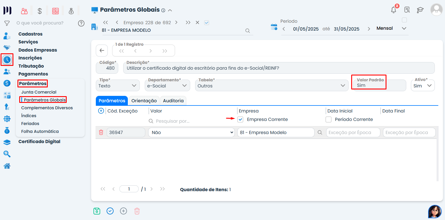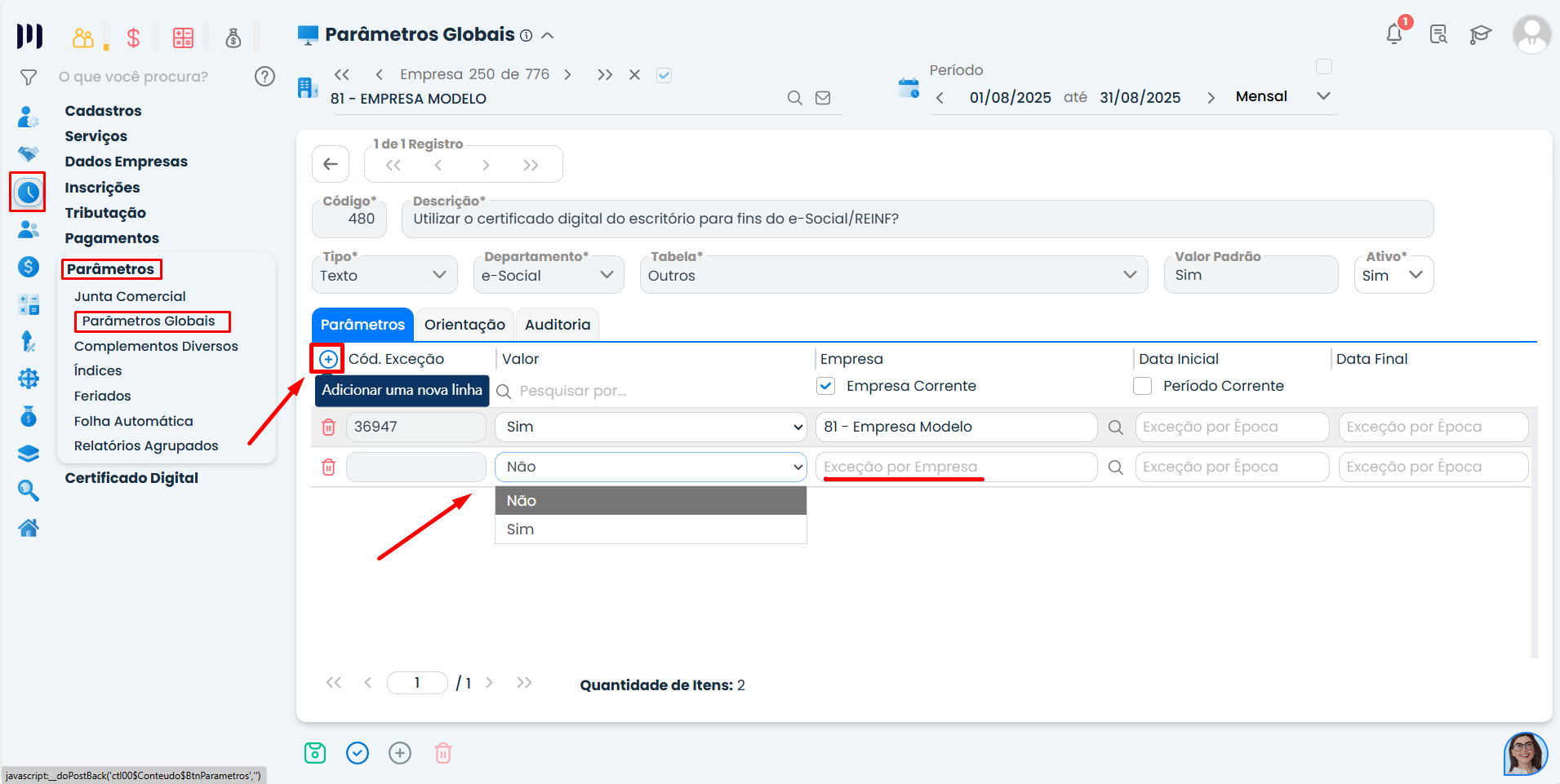 Passo 7: Para configurar uma exceção para uma empresa específica, clique dentro do parâmetro 480 e adicione a exceção:
