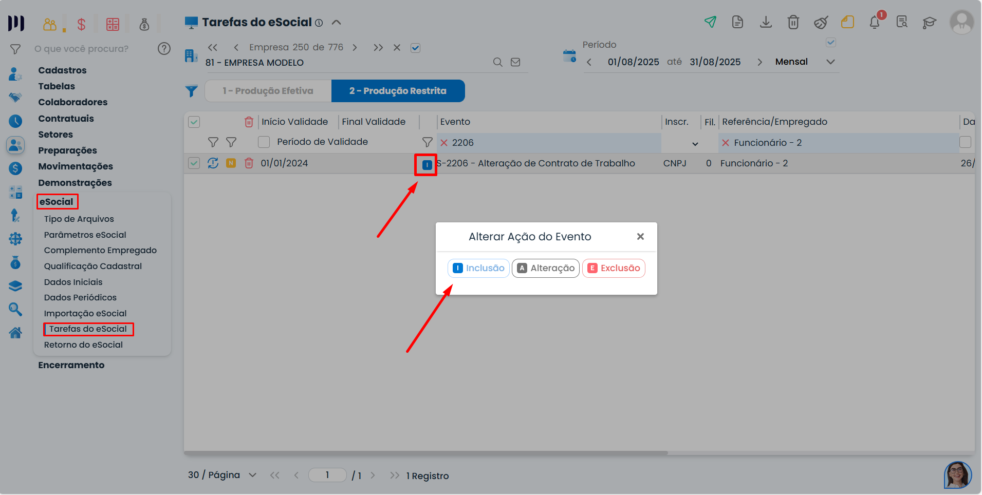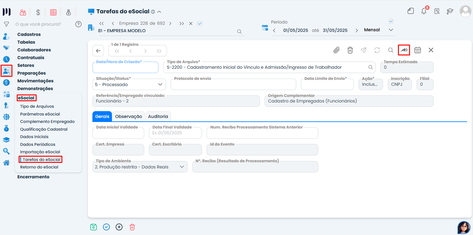 Passo 9: Altere o evento para inclusão e envie para o eSocial.