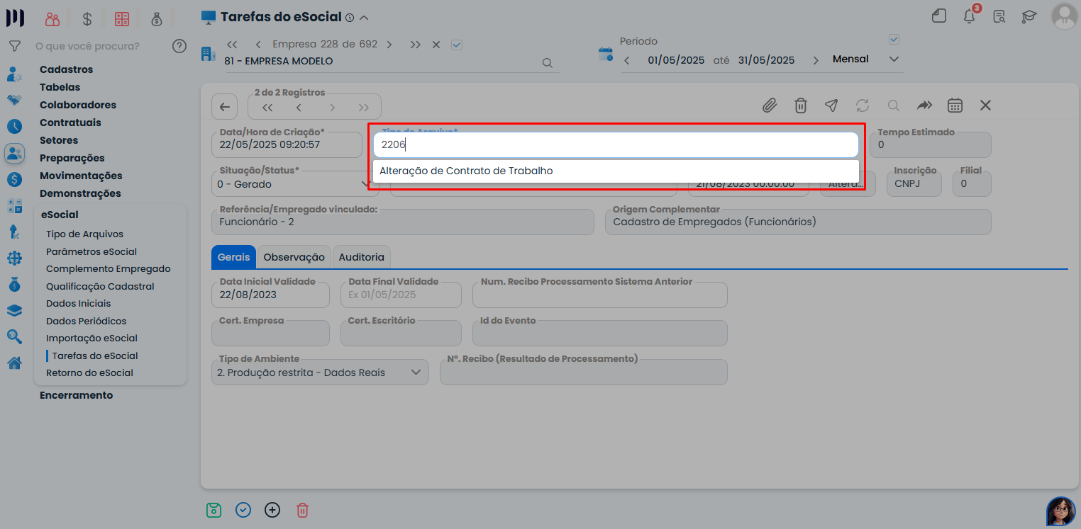 Passo 7: Altere o campo Tipo de Arquivo para S-2206 (Alteração de contrato);
