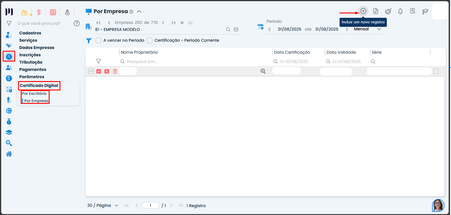 Passo 2: Verifique a validade do certificado, se está cadastrado corretamente da empresa na aba “empresa” e do escritório na aba “escritório”. Caso não visualize nenhum e não esteja cadastrado, cadastre clicando no canto superior direito, clique no botão “Adicionar novo certificado”;