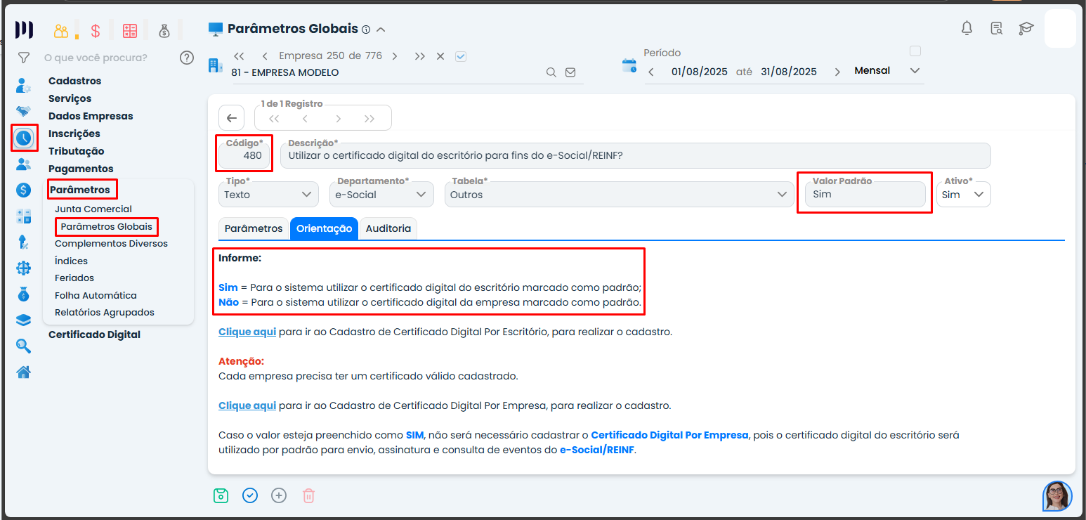Passo 3: Verifique se ele está configurado corretamente no campo “Valor”, de acordo com o certificado cadastrado, da empresa ou do escritório;