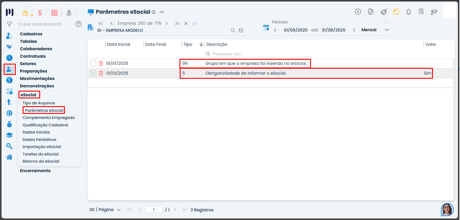 Passo 1: Acesse Pessoal>eSocial>Parâmetros do eSocial;