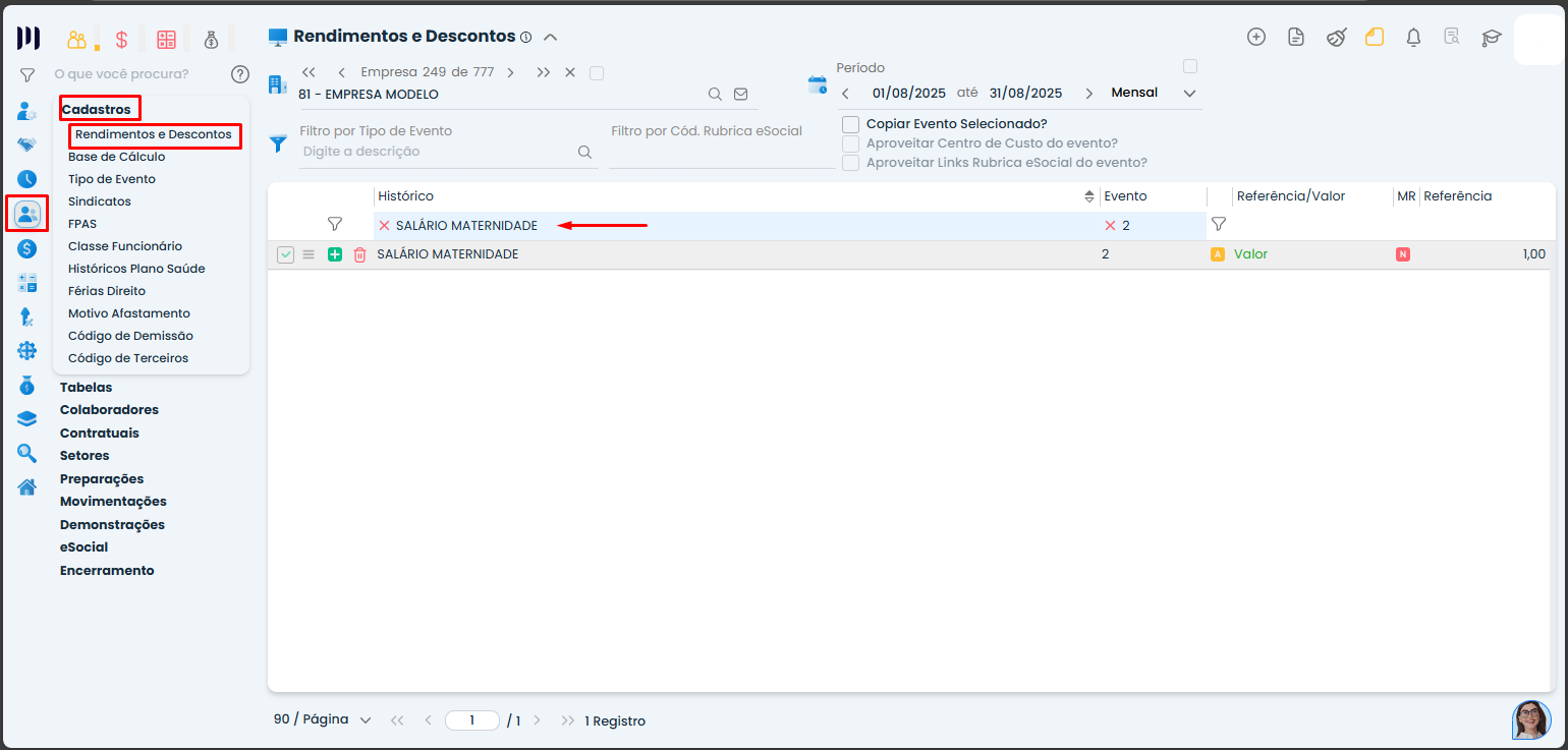 • Localize o evento utilizado para o pagamento do salário-maternidade;