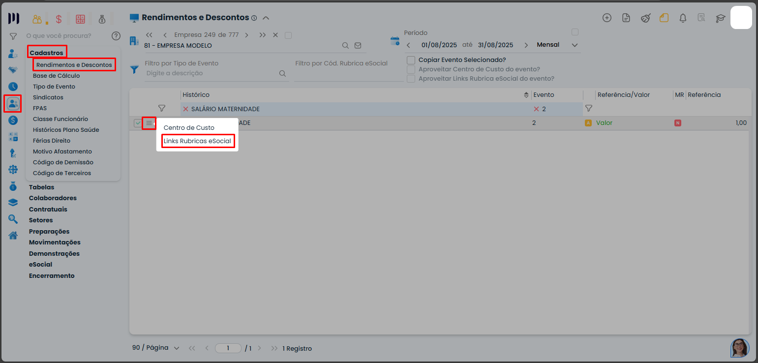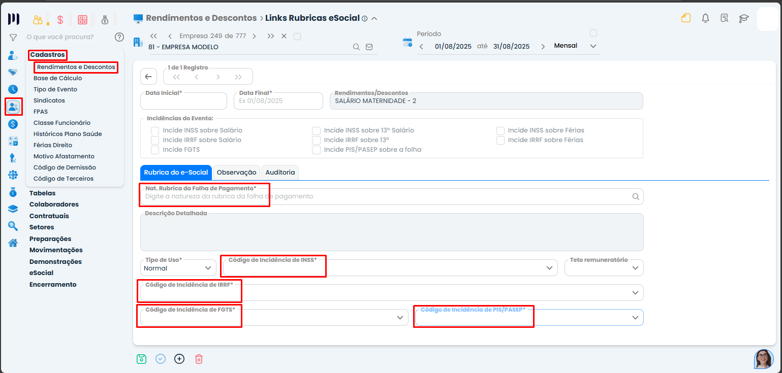 Passo 4: Na aba Links e Rubricas do eSocial, revise os campos de incidência;
