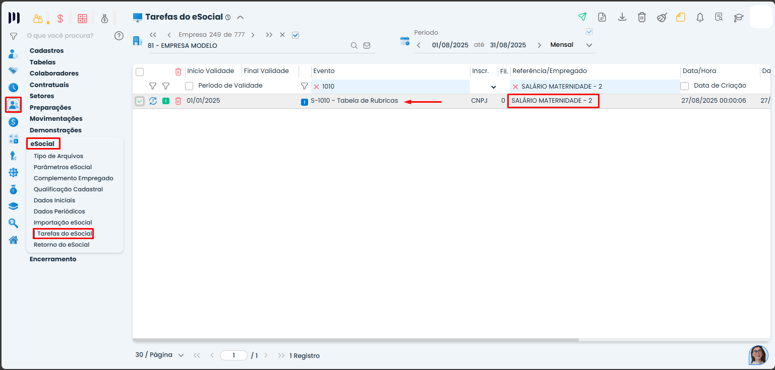 • Nesse caso, localize o evento S-1010 anterior da rubrica de salário-família na aba Pessoal>eSocial>Tarefas do eSocial;