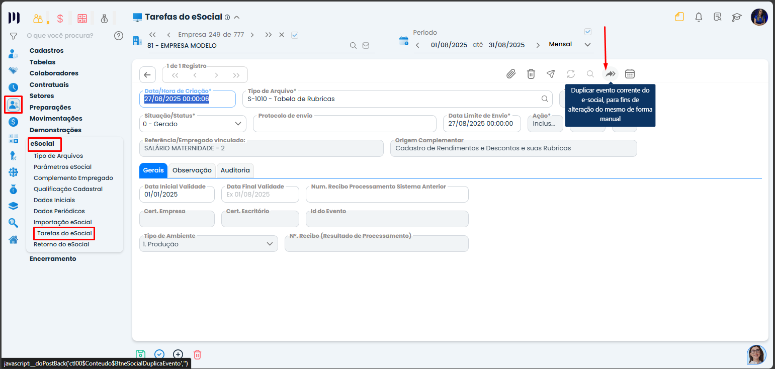 Passo 5: Se o sistema não gerar automaticamente o evento S-1010, isso significa que as configurações não foram alteradas;