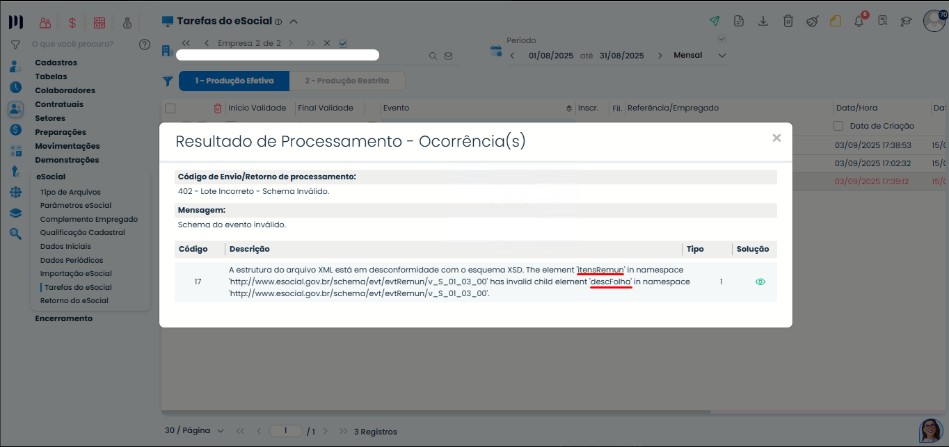 Validação eSocial 17: Resultado de Processamento – Ocorrência (s): Normalmente é apresentado no evento S-1200;