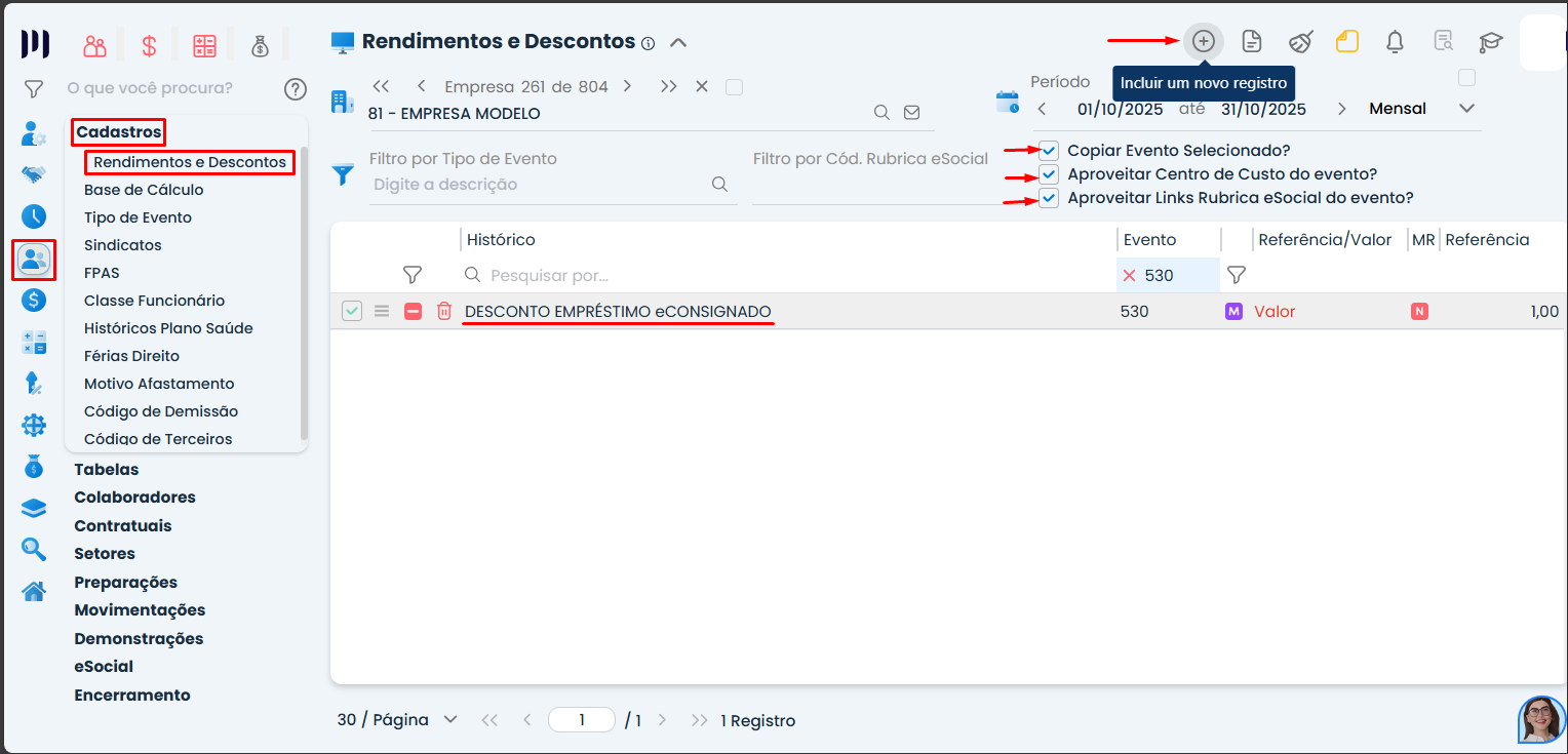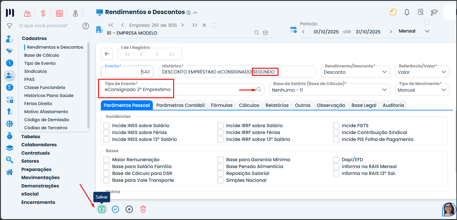 Acesse: Pessoal>Cadastros>Rendimentos e Descontos;
