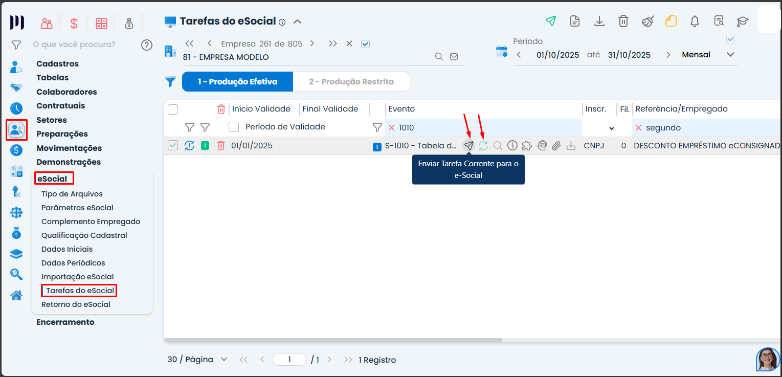 Localize os eventos S-1010 das rubricas criadas e faça o envio;