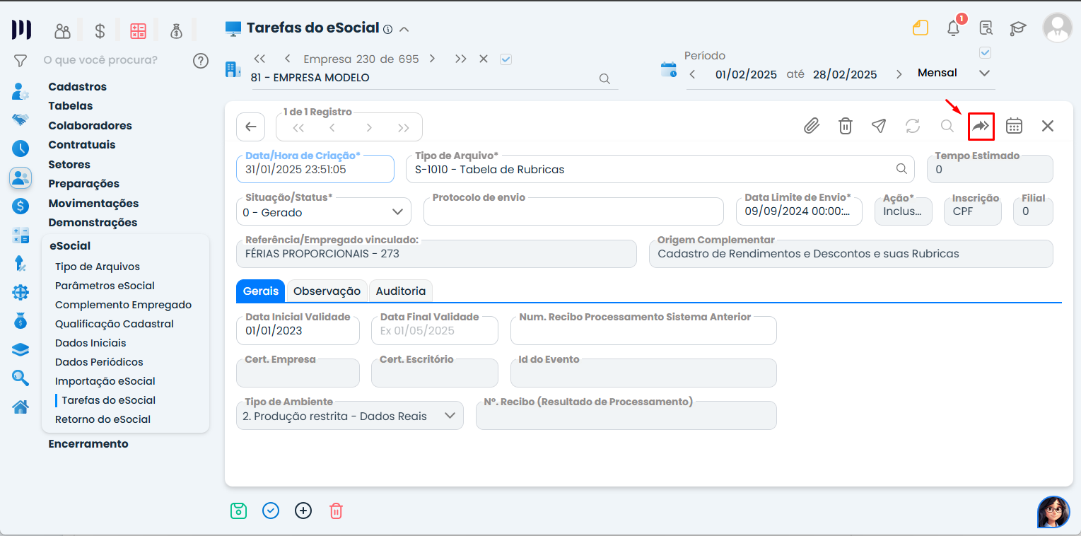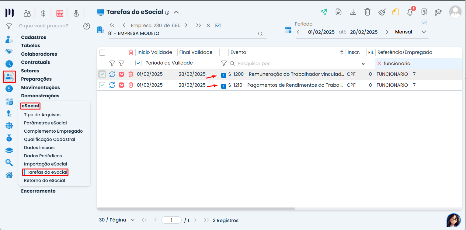 Acesse Pessoal > eSocial > Tarefas do eSocial para verificar os eventos gerados;