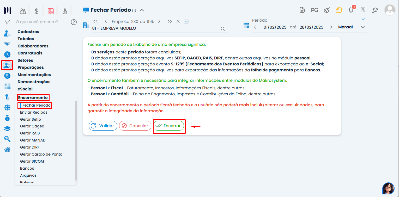 Acesse Pessoal > Encerramento > Fechar Período.