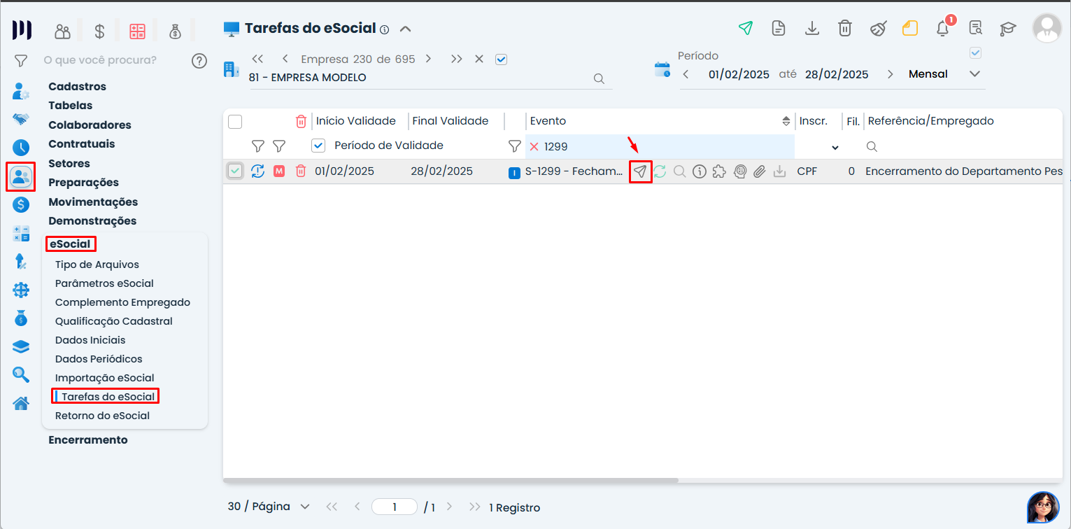 Acesse Pessoal > eSocial > Tarefas do eSocial e envie o evento S-1299 para concluir o processo de encerramento.