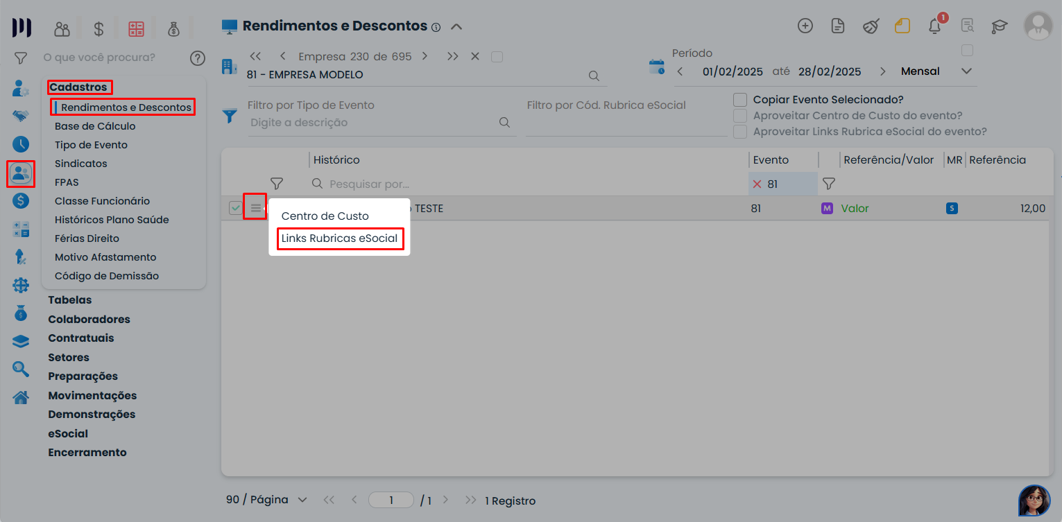 Pesquise pelo evento utilizado na folha do empregado e clique no subnível e acesse Links Rubricas eSocial;