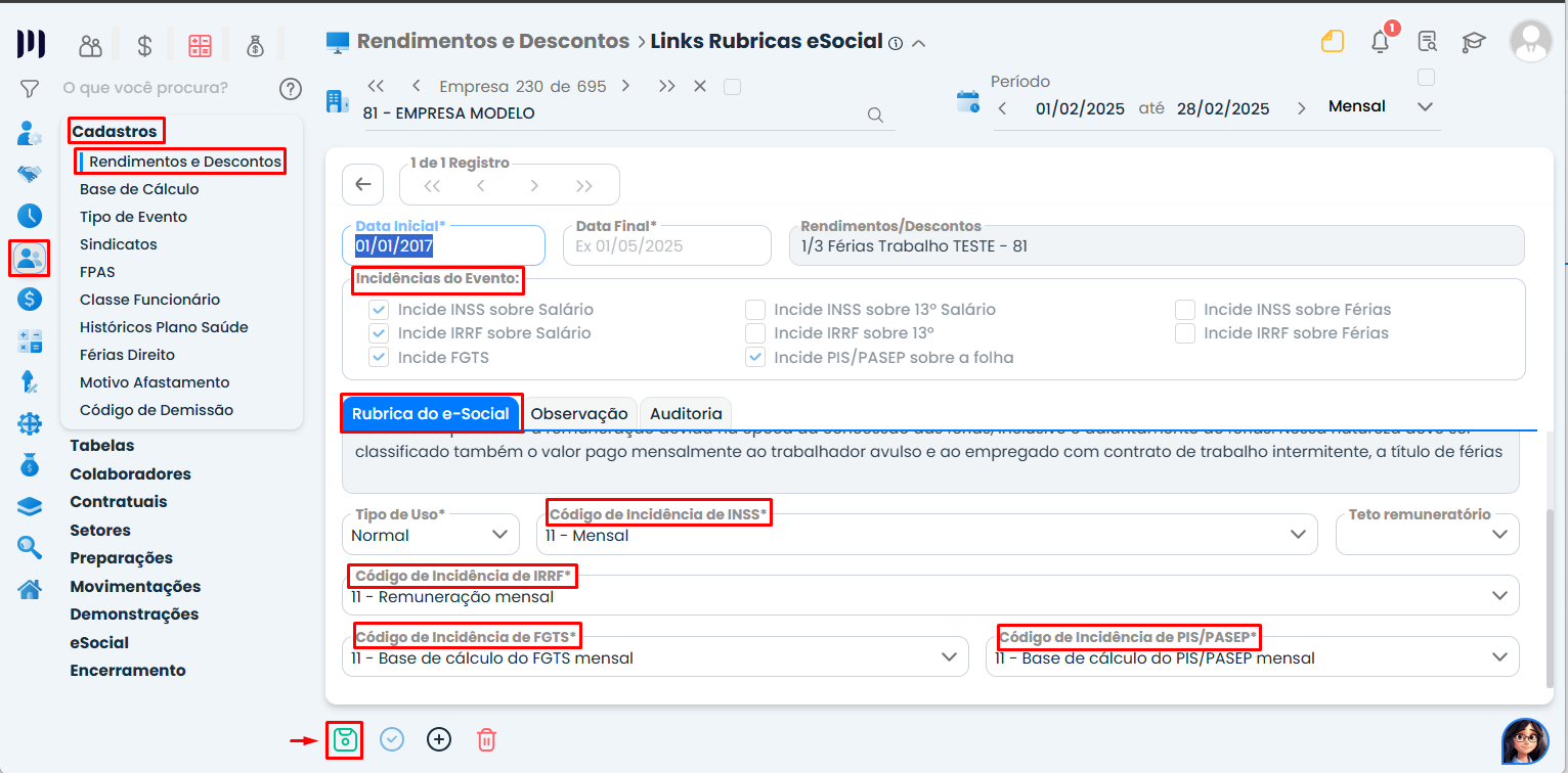 Na aba “Rubricas do eSocial”, confira se o cadastro da Natureza Rubrica da Folha de Pagamento e as incidências estão corretas;