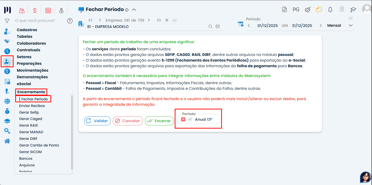 Passo 5: Agora, vá em Pessoal>Encerramento>Fechar período;