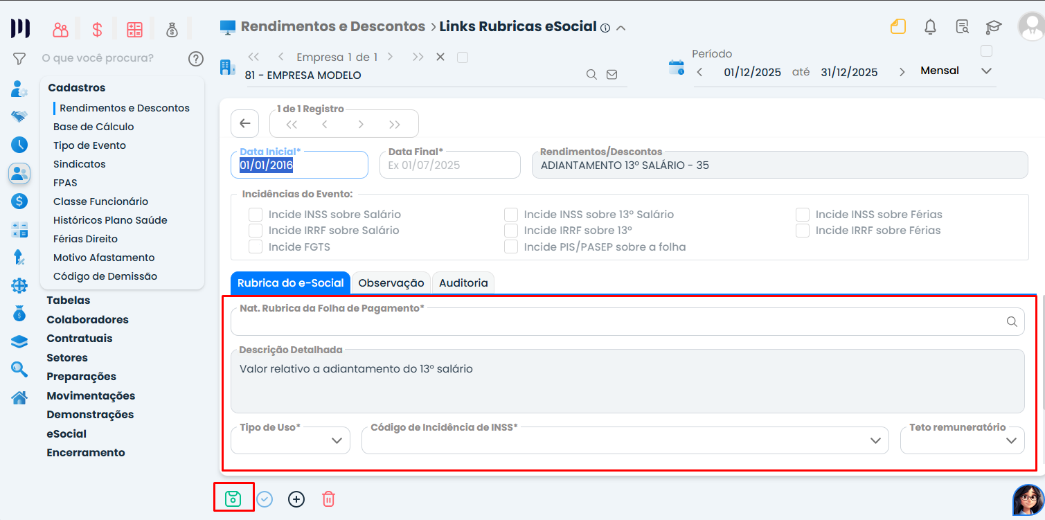 Passo 3: Na aba Rubricas do eSocial, verifique se a natureza da rubrica e as incidências estão corretas. Ajuste se necessário e clique em Salvar;