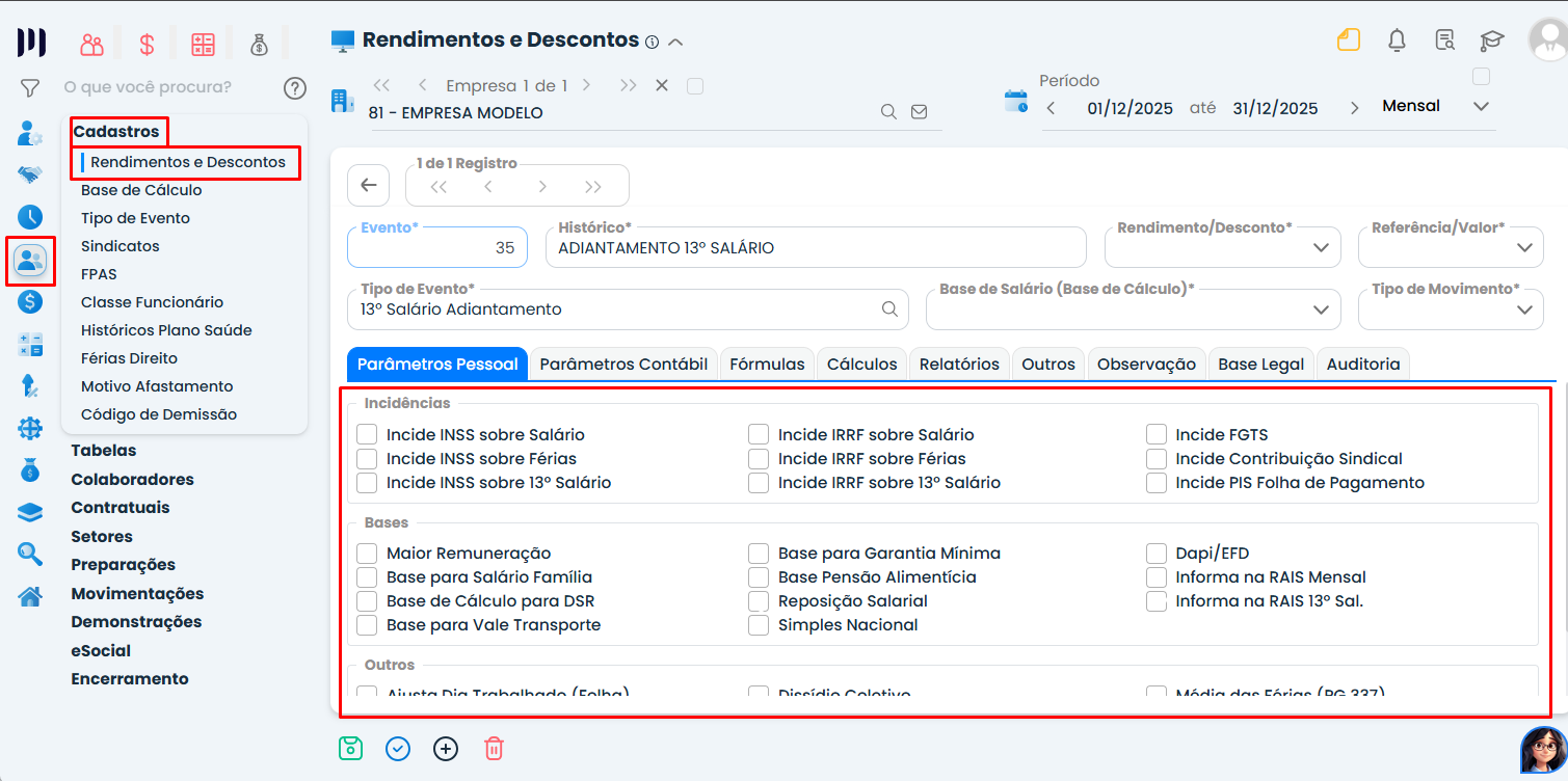 Passo 4: Volte ao cadastro do evento em Rendimentos e Descontos, clique na aba Pessoal e confira se as incidências marcadas estão alinhadas com o que foi ajustado na rubrica;