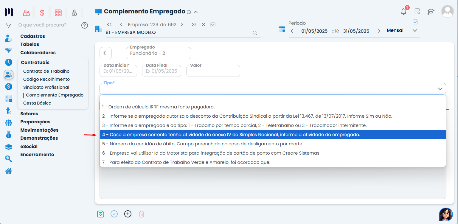 Passo 3: Cadastre o tipo 4, definindo se o funcionário terá atividade dentro do Anexo IV, fora do Anexo IV ou atividade concomitante.