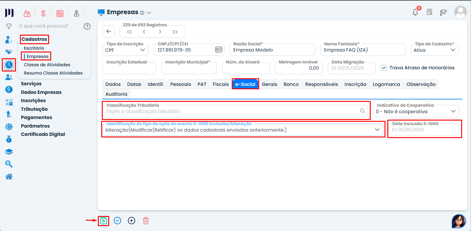Passo 3: Na aba eSocial, altere a classificação tributária para a correta.