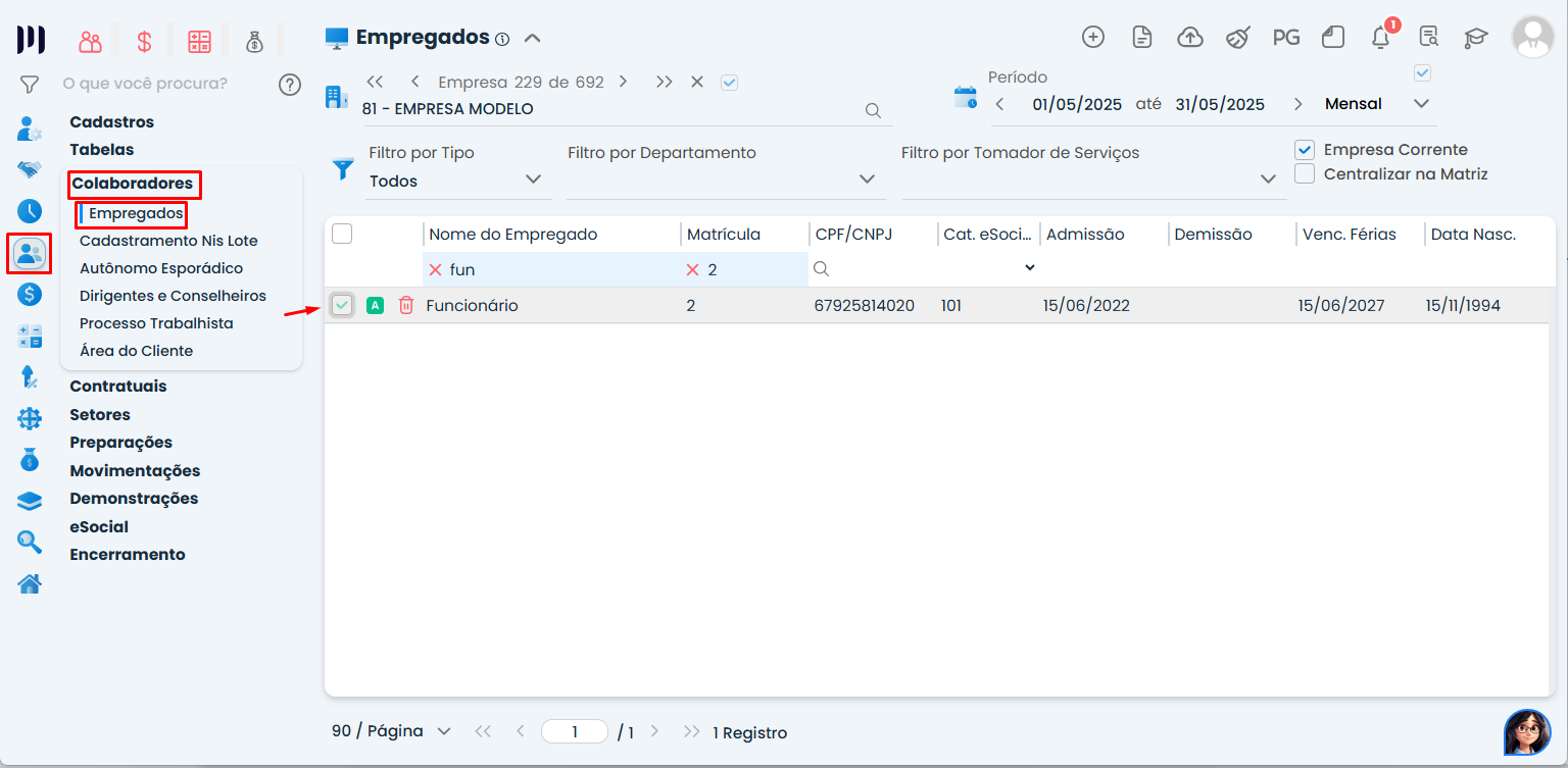 Passo 2: Vá para Colaboradores clique em Funcionários selecione o funcionário e abra Funções.