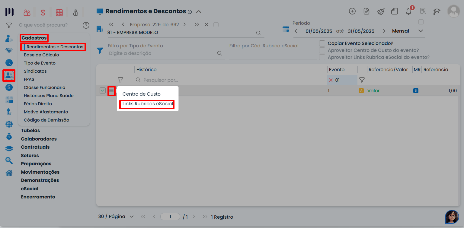 Passo 3: No subnível do evento que está tentando enviar o S-1010, clique em Links Rubricas eSocial.