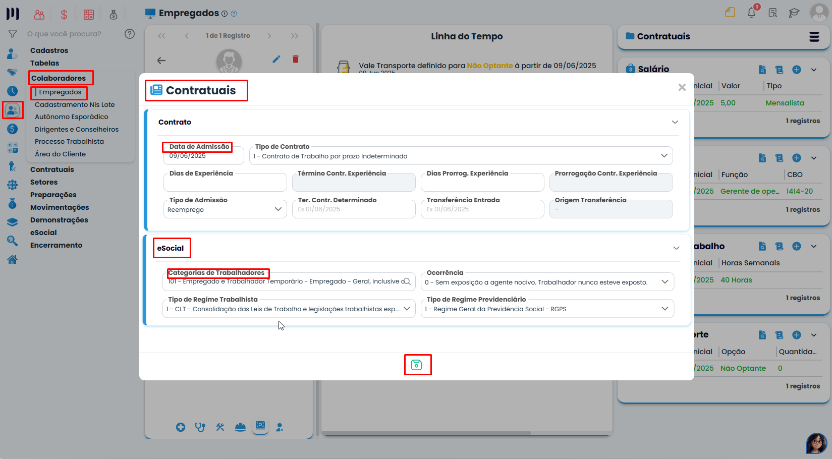 - Verifique também a data de admissão do colaborador no sistema e compare com a informação do evento S-2190, clique em salvar.