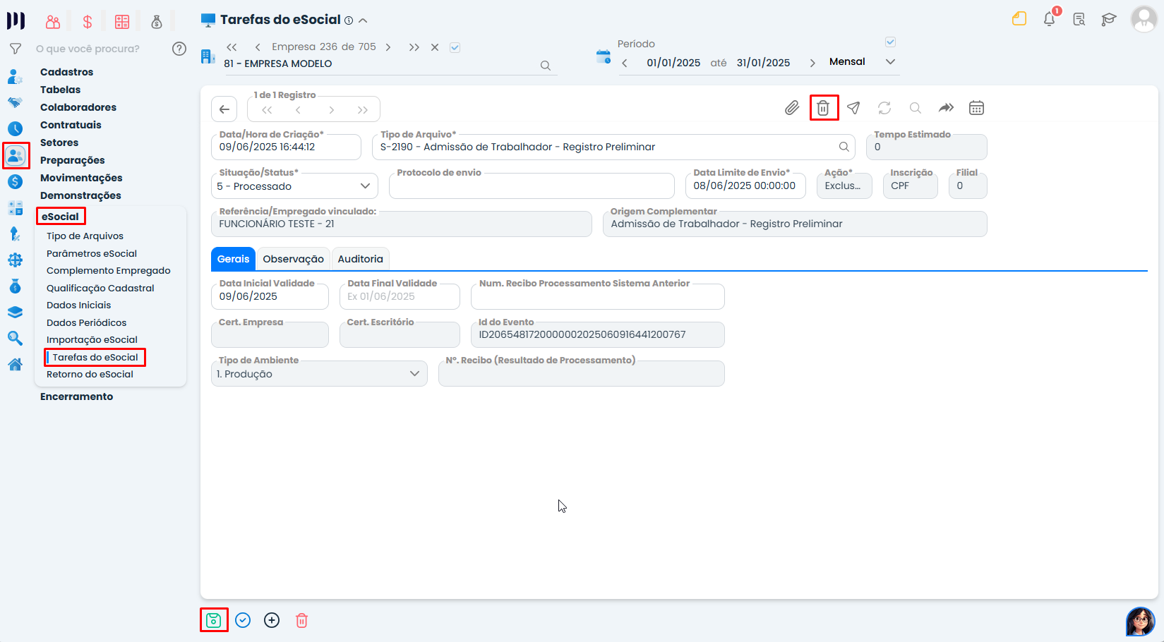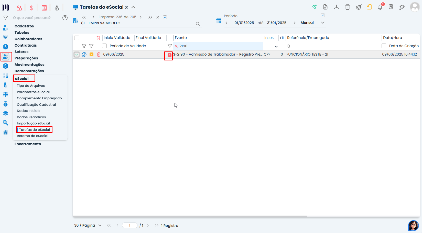 Se o evento S-2190 foi enviado com dados incorretos, será necessário gerar a tarefa de exclusão do S-2190, em tarefas do eSocial.