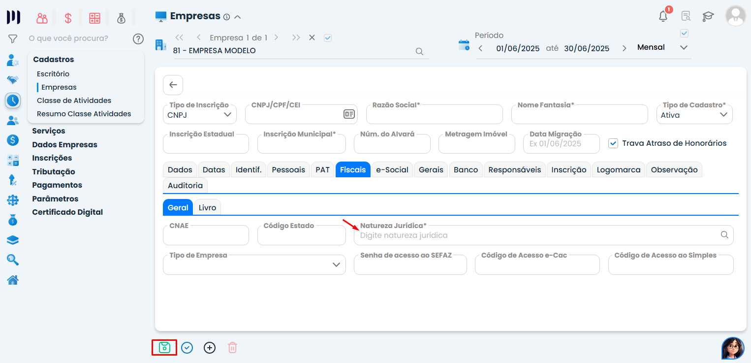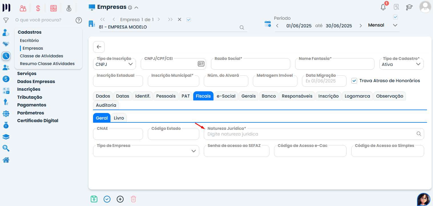 Ainda na aba Fiscais, revise o campo Natureza Jurídica.