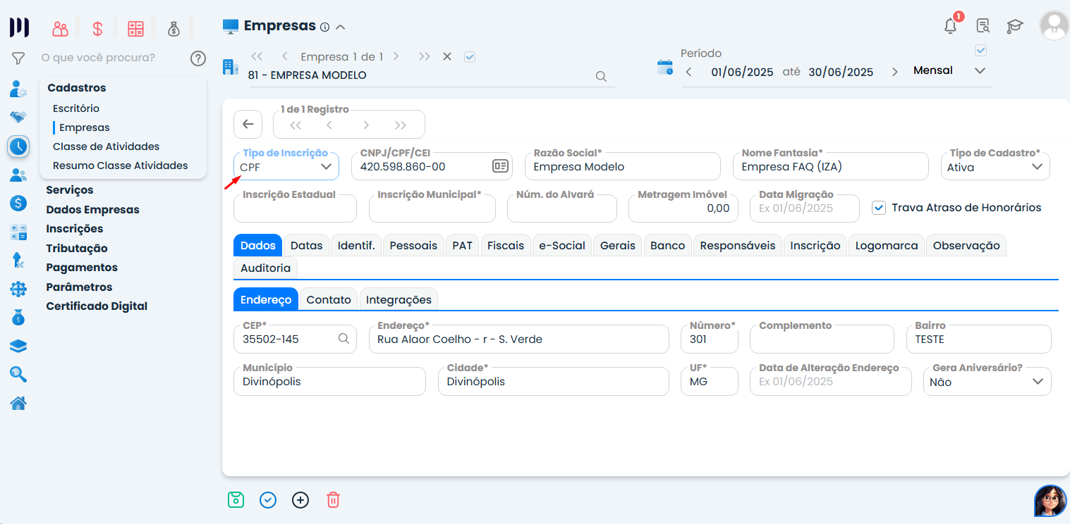Na aba Fiscais, verifique o campo Natureza Jurídica.