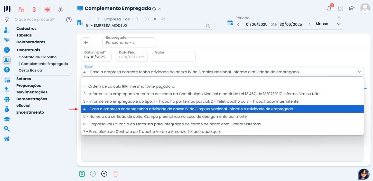 Importante: Esse tipo de complemento (tipo 4) só deve ser preenchido em casos específicos, como contribuição substituída para determinadas atividades. Quando não for aplicável, ele deve estar em branco.